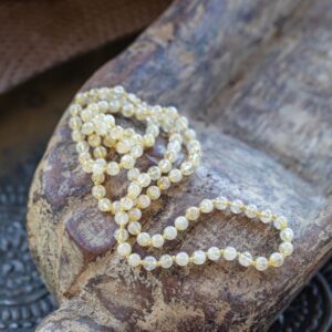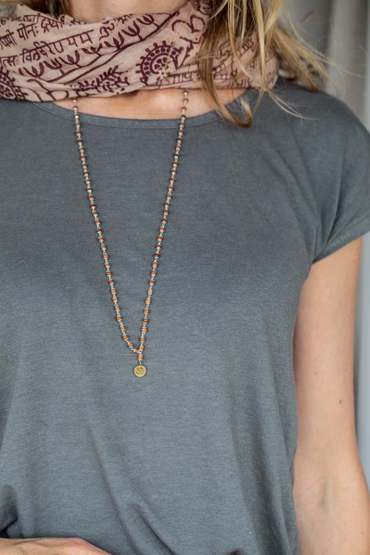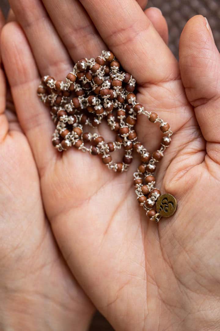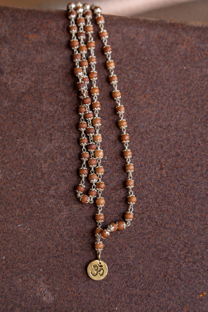 This exquisite mala is crafted from 925 Sterling Silver and Sandalwood, featuring 108 beads measuring 4mm each, complemented by a brass Om pendant. Sandalwood, celebrated for its comforting and warm fragrance, holds a prominent place among India’s sacred beads, believed to harbour mystical qualities. The sacred resonance of “Om” encapsulates the unity of all existence, transcending temporal and spatial boundaries. It serves as a profound reminder of life’s interconnectedness and the journey toward spiritual enlightenment.